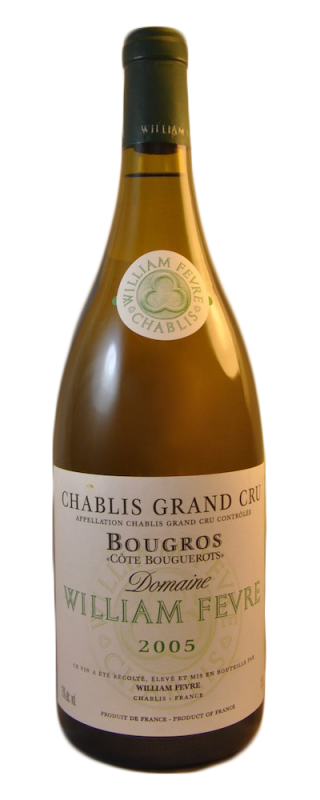 L'appellation Chablis, situé au nord de la Bourgogne près d'Auxerre, longe la petite rivière le Serein. Dès le 12ème siècle, les moines cisterciens travaillaient les vignes de Chablis. Le vignoble, couvrant plus de 4000 hectares, produit exclusivement des blancs secs, issus à 100 % du cépage Chardonnay. D'une manière générale, ce sont des vins frais, vifs, au nez très minéral. Les 1er Crus et les Grands Crus ont besoin de quelques années de garde afin de s'ouvrir : ils sont plus structurés, plus fins, plus subtils, avec une belle longueur en bouche. Issu d'un terroir très pentu, ce Grand Cru Bougros Côte Bouguerots Domaine Fèvre possèdent des arômes complexes et d'intenses notes minérales. Il est ample, profond, dense, tout en demeurant parfaitement élégant et subtil. Un Chablis Grand Cru à son apogée, sublimé par le légendaire millésime 2005...