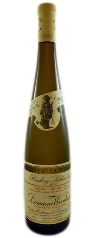 Le Riesling, cépage le plus connu d'Alsace, développe un bouquet d'une grande finesse : des arômes minéraux (pierre à fusil, silex), de fruits (citron, pamplemousse, pêche, poire) et de fleurs (fleurs blanches, tilleul). Les Riesling du Domaine Weinbach sont des vins racés, nerveux, dotés d'une grande longueur. Le Grand Cru Schlossberg sublime l'expression de ce cépage, pour offrir des vins frais, très purs, d'une grande finesse. Ici en millésime 2011, la cuvée Sainte Catherine (partie basse du Grand Cru Schlossberg) est le plus doux des Rieslings secs du domaine : c'est un vin plus ample et plus gras que les cuvées Schlossberg, avec une puissance aromatique très poussée. Un très grand vin illustrant à merveille la splendeur de son terroir. Il peut se garder au moins une décennie.